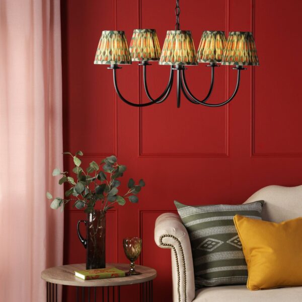 The Becca 5 light ceiling pendant light comes from Dar Lighting collection. This versatile black pendant boasts five sweeping arms, creating an elegant silhouette that’s both eye catching and functional. Complemented by five Ikat red and green shades to diffuse light beautifully. Perfect for dining rooms or entryways. FEATURES: * Ceiling pendant light * Matt Black finish * Red and green shades * Requires 5 lamps * Double insulated * Dimmable with suitable lamp / dimmer switch * Height adjustable prior to installation SIZE: * Drop: 38-125cm * Diameter: 72cm * Ceiling plate diameter: 10cm LAMP: * Requires 5 x Small Edison Screw LED Candle Lamps – NOT INCLUDED