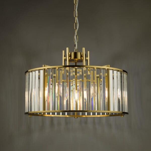 The Kiran 5 light ceiling pendant light from Dar Lighting is a stunning lighting fixture that blends modern aesthetics with classic elegance. The light features a Natural Brass finish, which adds a touch of sophistication, while the faceted glass creates a captivating light display when the pendant is illuminated. This light would be perfect for a living room, bedroom, or an entrance. FEATURES: * Ceiling pendant light * Natural Brass finish * Crystal glass * Earthed * Requires 5 lamps * Dimmable with suitable lamps and dimmer switch * Height adjustable prior to installation * Weight: 5.5 kg SIZE: * Diameter: 50cm * Drop: 45-157cm LAMP: * Requires 5 x Small Edison Screw LED Candle Lamps – NOT INCLUDED