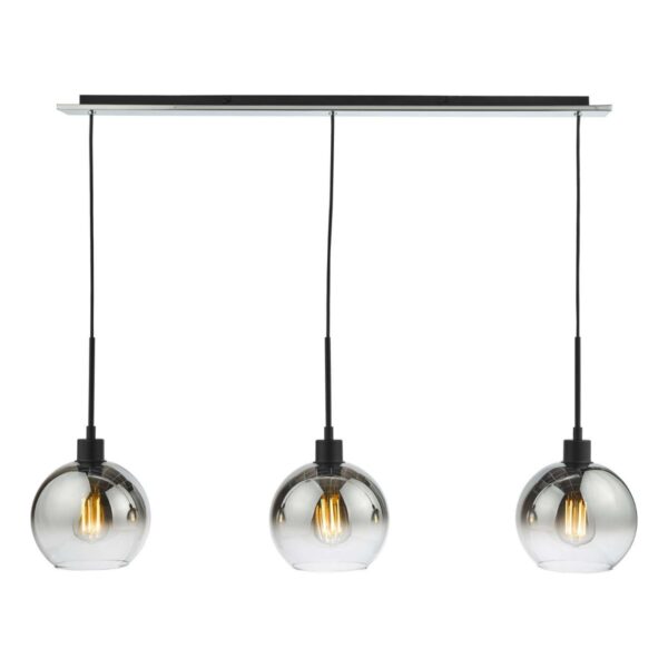 This Lycia ceiling bar pendant light from Dar Lighting features large mirrored ombre glass globes which are able to take small globe lamps or vintage LED. The ceiling plate features a mirror polished plate with black detailing. The fitting would look great above the table or kitchen island. FEATURES: * Ceiling bar pendant light * Matt Black details * Mirrored polished plate * Mirrored ombre glass shades * 3 lamps required * Double insulated * Height adjustable prior to installation SIZE: * Drop: 420 – 1350 mm * Width: 1000 mm * Depth: 200 mm BULBS: * Takes 3 x Edison Screw LED GLS – NOT INCLUDED