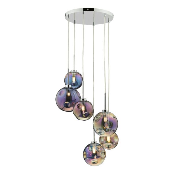 Dar Lighting Mira 6 Light Cluster Ceiling Pendant Light In Polished Chrome With Iridised Glass