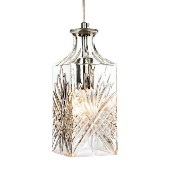 This Firstlight Decanter one light rectangular ceiling pendant light is finished in chrome and has a clear cut glass shade.ᅠ The light is similar in design to a wine decanter making it an instant talking point in any room.ᅠ This unusual light would make an incredible addition to any home. Product code: 3447CH FEATURES: * Finished in chrome with clear glass * Dimmable * Also available on a cluster ceiling pendant (please see website) SIZE: * Height – 100sq * Maximum drop – 1200mm * Diameter – 250mm BULBS: * Takes 1x 40 watt E14 Small Edison Screw Bulbs – Not included * Also suitable for use with LED bulbs.
