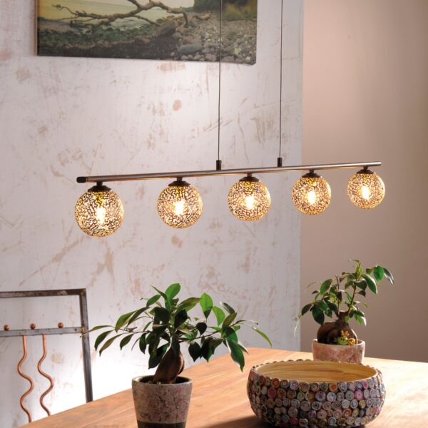 5 LIGHT BAR CEILING PENDANT LIGHT IN RUST FINISH WITH GOLD SHADES 2040-48 * Breakfast bar ceiling pendant light * Rust finish * Gold shades * 5 x 40 watt max G9 halogens (not included) * Modern and elegant design * Dimmable with suitable lamp / dimmer switch * Length 1320mm, Width 100mm, Max drop 1500mm * Height adjustable at the point of installation