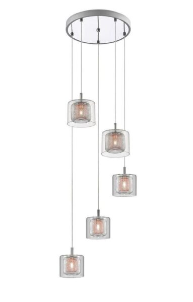 This Impex Laure five light ceiling cluster light is finished in chrome and copper.ᅠ The ceiling rose and the outer shade are polished chrome and the light features a stunning inner shade contructed of copper.ᅠ With the lights being suspended at different heights and the modern appearance and sleek lines, this light would look striking in any room. Product code: PGH606101/05/CU/CH FEATURES: * Finished in chrome and copper * Dimmable * Weight – 4.2kg * Matching items available (please see website) SIZE: * Diameter – 440mm * Height – 1340mm BULBS: * Takes 5x 28 watt G9 Halogen Bulb – Not included * Also suitable for use with LED bulbs.