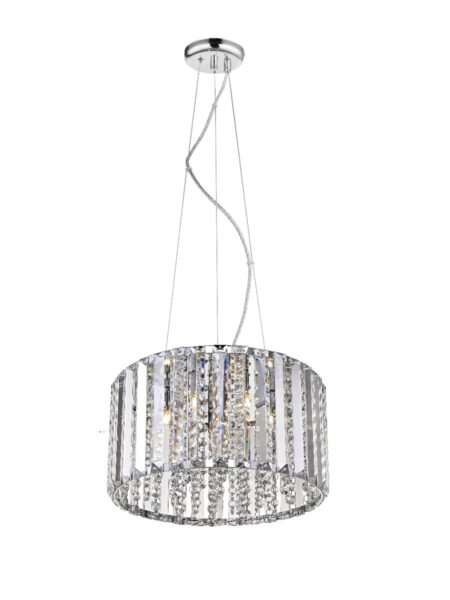 This stunning crystal ceiling pendant light comes from Sophia Range. The light features cut crystal arranged beneath a contemporary polished chrome band. A quintessential statement ceiling light, perfect for a grand entrance hall, living room or over a dinning table. Its layers of beautiful coffin crystal look truly spectacular when lit. FEATURES: * Crystal ceiling pendant light * Polished chrome finish * Double insulated * Takes 6 lights * Dimmable with suitable lamp / dimmer switch * Height adjustable at the point of installation SIZE: * Diameter: 52 cm * Height: 47 cm * Drop: 36 – 146 cm * Weight: 6.9 kg BULB: * Takes 6 x G9 LED lamps-NOT INCLUDED