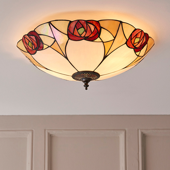 The Ingram ceiling flush light features the famous Mackintosh style Art Deco rose. Made from Tiffany style glass with a bronze effect trim. Dimmable and suitable for use with LED lamps. FEATURES : Material : Glass, Steel Finish : Tiffany, Dark Bronze 2 x 60W E27 GLS (bulb not included) Compatible with LED lamps Tiffany glass & dark bronze finish with highlights Constructed from glass & steel Available at an affordable price Images shown are for illustration purpose only DIMENSIONS : Projection : 180mm Diameter : 450mm