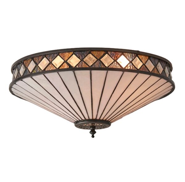 This Interiors 1900 Tiffany Fargo medium 2 light flush ceiling light is finished with clean lines and subtle colours.ᅠ The pearlescent design would make a striking addition to any room ᅠ FEATURES * Flush ceiling light with subtle finish * Complete with shade * Earthed * Dimmable ᅠ SIZE * Projection – 170mm * Diameter – 412mm ᅠ BULBS * Takes 2x 60 watt E27 Edison Screw Bulbs – not included.