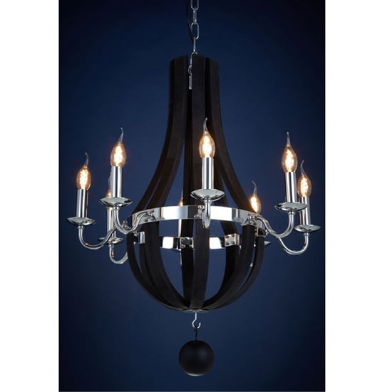 This boutique hotel style chandelier uses smooth eucalyptus wood to recreate the traditional basket design FEATURES : Material : Iron, Eucalyptus Wood Finish : Black Its body is formed from a series of lateral strips made from sustainable eucalyptus wood The sleek black finish counterpoints the silver iron band that clasps its circumference Eight curving arms emerge from the band, each one supporting a cylindrical mount which holds a waved glass shade A black wooden orb hangs beneath the body, corresponding with the body’s rounded shape Available at an affordable price Images shown are for illustration purpose only DIMENSIONS : Height : 143cm Width : 60cm Depth : 60cm