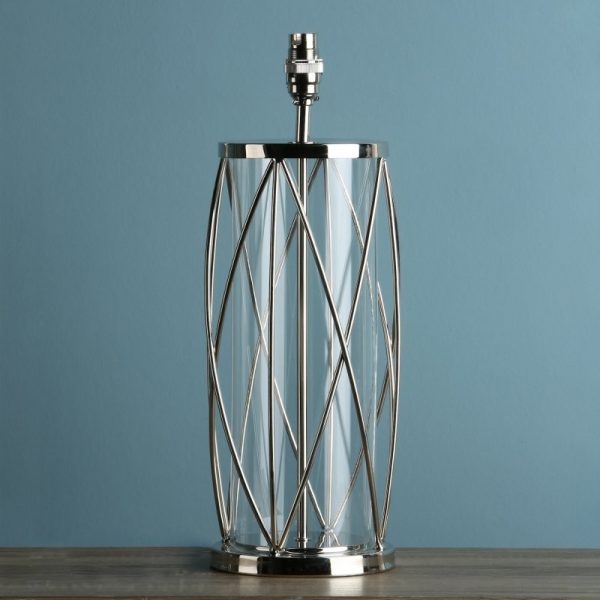 The Laura Ashley Beckworth is a modern large table lamp base in a gorgeous lantern style. A slick, curved lattice in vintage polished nickel encasing a clear glass cylinder gives this table light a contemporary style that enhances any interior theme. The table lamp base has a discreet clear cable with a convenient push bar switch. Optional shades are available to order (please call the office).  Features Table lantern Polished Nickel finish Clear glass Takes 1 lamp Class 1 (earthed) Push bar switch Shade to be ordered separately  Size: Height: 43 cm Diameter: 15 cm  Bulbs Requires 1 x 60 watt max B22 GLS (not included) Ideal for use with LED lamps