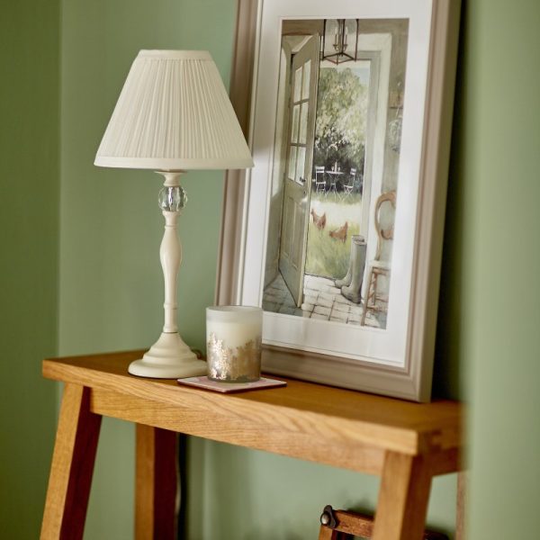 The Laura Ashley Ellis table lamp is featuring a satin cream spindle base incorporating a pretty faceted glass ball and a traditional look with a clean finish. Because of its light colour, it is versatile enough to work into a contemporary or traditional theme with equal ease. The table lamp comes complete with Ivory cotton shade and has a discreet clear cable with a convenient in-line rocker switch. Features Table lamp Satin Cream finish Ivory cotton shade Crystal detail Takes 1 lamp Class 2 (double insulated) In line cord switch Size Height: 43 cm Diameter: 21 cm Bulbs Requires 1 x 40 watt max Small Edison Screw Candle Lamp (not included) Ideal for use with LED lamps