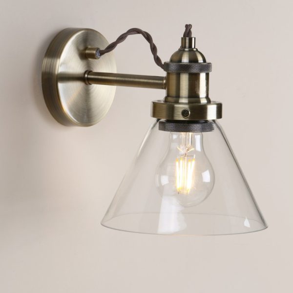 The Laura Ashley Isaac is a single wall light that fits effortlessly into any room. Bold lines and angular shapes lend a sophisticated, contemporary touch that looks fantastic against bare brickwork. This contemporary light boasts industrial appeal with an antique brass finish and cone-shaped clear glass shade.  Features Wall light Antique Brass finish Clear glass shade Takes 1 lamp Class 2 (double insulated) Dimmable with suitable lamp / dimmer switch  Size: Height: 19 cm Width: 17 cm Depth: 22 cm  Bulbs Requires 1 x 40 watt max Edison Screw GLS (not included) Ideal for use with LED lamps
