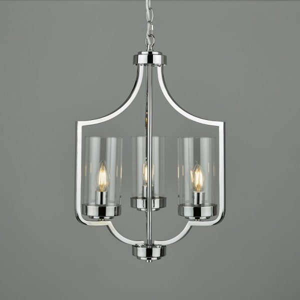 The Laura Ashley Joseph 3 Light Ceiling Chandelier is a graceful blend of clear glass and sleek metal. A simple clear glass shades combined with a polished chrome finish for effortlessly elegant looks. The fitting has a matching finish ceiling rose and hanging chain plus a clear cable. Height is adjustable at the point of installation.  Features Ceiling pendant light Polished Chrome finish Clear glass shades Class 1 (earthed) Takes 3 lamps Dimmable with suitable lamp / dimmer switch Height adjustable at the point of installation  Size Drop: 62 – 162 cm Diameter: 40 cm  Bulbs Requires 3 x 40 watt max Small Edison Screw Candle Lamps (not included) Ideal for use with LED lamps