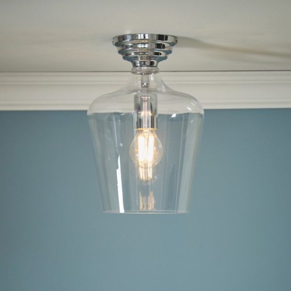 The Laura Ashley Ockley is a single semi flush ceiling light that fits effortlessly into kitchens and dens. Bold lines and bottled-like shapes lend a sophisticated, contemporary touch that looks fantastic against bare brickwork. This contemporary ceiling light boasts industrial appeal with a polished chrome finish and clear glass shade. Pair with vintage filament LED lamp to complete the look. Features Semi flush ceiling light Polished Chrome finish Clear glass shade Takes 1 lamp Class 2 (double insulated) Dimmable with suitable lamp / dimmer switch This product has a blown glass and as such will all vary slightly and no two glasses are can be identical and some small bubbles are to be expected Size: Height: 31 cm Diameter: 21cm Bulbs Requires 1 x Edison Screw LED GLS – not included