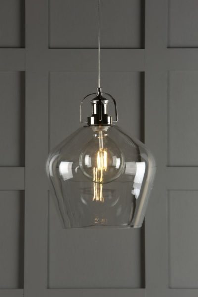 The Laura Ashley Rye is a single ceiling pendant light that fits effortlessly into kitchens and dens. Bold lines and round shapes lend a sophisticated, contemporary touch that looks fantastic against bare brickwork. This contemporary hanging ceiling light boasts industrial appeal with a polished nickel finish and clear glass shade. The fitting has a matching ceiling rose and a clear cable. Height is adjustable at the point of installation. Features Ceiling pendant light Polished Nickel finish Clear glass shade Takes 1 lamp Class 2 (double insulated) Dimmable with suitable lamp / dimmer switch Height adjustable at the point of installation This product has a blown glass and as such will all vary slightly and no two glasses are can be identical and some small bubbles are to be expected Size: Drop: 41 – 141cm Diameter: 30cm Bulbs Requires 1 x 40 watt max Edison Screw GLS (not included) Ideal for use with LED lamps