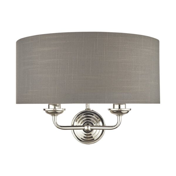 The Laura Ashley Sorrento is a subtle and sophisticated double wall light. The light features a single contemporary shade in sleek grey linen fabric with a pearlised inner. This 2 light wall fitting has a round, Art Deco style, stepped wall plate, and comes in a traditional polished nickel finish, adding grown-up atmosphere to your dining or living area. FEATURES * Wall light * Polished Nickel finish * Grey linen shade * Takes 2 lamps * Class 2 (double insulated) * Dimmable with suitable lamp / dimmer switch SIZE: * Height: 25 cm * Width: 35 cm * Depth: 18 cm BULBS * Requires 2 x 40 watt max Small Edison Screw Candle Lamps (not included) * Ideal for use with LED lamps