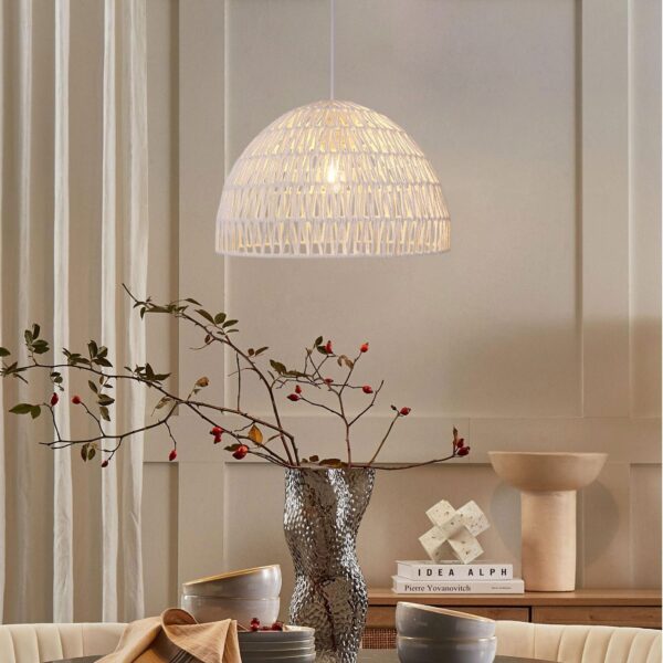 Description:. This eco-friendly handwoven white rope ceiling pendant light brings a chic and natural aesthetic to your home, combining rustic charm with modern minimalist elegance. Made from intricately woven sustainable rope, this pendant light creates a soft ambient glow perfect for cosy spaces. Whether you’re lighting a kitchen island, enhancing your bedroom pendant light setup, or styling a living room ceiling pendant light, this versatile fixture blends beautifully with boho, Scandinavian, or farmhouse interiors, offering both function and style in one timeless piece.. Features:. Eco-friendly Handwoven Rope Design: Crafted with sustainable, natural materials, offering both beauty and environmental responsibility.. Soft Ambient Lighting: Perfect for creating a cozy and welcoming ambiance in your home.. Versatile for Multiple Spaces: Ideal for living rooms, dining rooms, or bedrooms, this pendant light suits various interior styles.. Minimalist Design: The clean, simple shape fits seamlessly into bohemian or nature-inspired interiors, bringing an organic touch to your home d ̈¦cor.. Natural Elegance and Modern Simplicity. This handwoven paper rope pendant light brings a natural and organic touch to your home, effortlessly blending rustic charm with minimalist design. Its soft light creates a peaceful, serene atmosphere perfect for any room.. Soft, Warm Illumination. The woven rope structure allows light to filter through, casting a gentle, inviting glow that makes any space feel cozy and welcoming. Ideal for living rooms, dining rooms, or bedrooms.. Eco-Friendly Design. Crafted with sustainable materials, this pendant light not only enhances your d ̈¦cor but also supports an eco-conscious lifestyle. It¡ ̄s a stylish yet responsible choice for any home.. Product Information. Material. Iron+Paper Rope. Shade Colour. White. Canopy Colour. /. Cord Colour. /. Adjustable Hanging Length. Adjustable(50cm-100cm(¡À 3cm)). Numble of Light Source. 1*E27. Bulb Included. Yes. Light Source Colour. Warm Light. Colour Temperature. 2700K. Dimmable. No. Light Direction. Ambient. Wattage. 8 Watt. Voltage. 220V-240V. Power Source. Hardwired. Specifications. Product Dimension. 40cm Dia ¡Á 26cm H(¡À 3cm). Ceiling Plate Dimension. 12cm L¡Á 12cm W¡Á 2.5cm H(¡À 3cm). Packing Dimension. 41cm L¡Á 41cm W¡Á 26cm H(¡À 3cm). Weight. 1.5kg(¡À 0.5kg). Package Included. 1 ¡Á Pendant Light. 1 ¡Á Installation Instruction. Warranty. Certification. CE. Product Warranty. 1 Year. Installation Manual. Download. FAQ. Q1: Is this handwoven pendant light suitable for a kitchen island?. A: Yes, it works beautifully as a kitchen pendant light, especially over islands or breakfast bars. The soft glow adds warmth without being too bright.. Q2: Can I use this ceiling pendant light in the bedroom?. A: Absolutely. This bedroom pendant light provides gentle, ambient lighting, ideal for relaxing spaces like bedside areas or reading corners.. Q3: Does this white rope pendant light come with a bulb?. A: No, the light fitting is bulb-ready and compatible with standard E27 bulbs, allowing you to choose the colour temperature you prefer.. Q4: How long is the hanging cord for this rope pendant light?. A: The adjustable hanging cord is approximately 100 cm, so you can customise the drop based on your ceiling height or space.. Q5: Is this suitable for UK ceiling pendant installations?. A: Yes, it’s designed for standard UK pendant light fittings, and comes with clear installation instructions for quick setup.. Q6: Can I group these as cluster pendant lights?. A: Yes, many customers install them in pairs or trios to create a cluster pendant light effect over dining tables or stairwells.