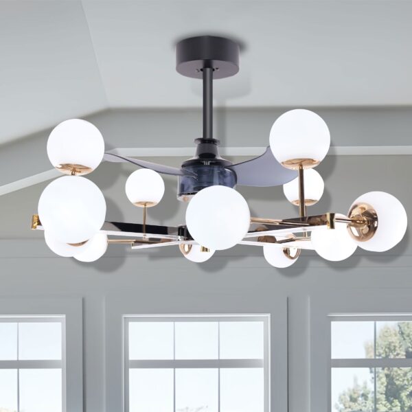 Description:. Enhance your space with the Modern Sphere 3-Blade ceiling fan with light, an incredible fusion of form and function. This ceiling fan with light features a stylish, modern sphere design with three beautifully crafted blades. The black and gold finish adds a touch of luxury, making it a standout piece in any room. It combines the practicality of an overhead fan light with the elegance of a modern design, perfect for those seeking both style and comfort.. Features:. Whisper-Quiet Operation: The high-performance motor ensures quiet comfort and steady airflow, making it a perfect fan light ceiling solution for peaceful, relaxing spaces.. Reversible Blades: Enjoy cool breezes in summer and improved circulation in winter with forward and reverse rotation, ensuring your ceiling fan with light is versatile throughout the year.. 6-Speed Settings: Customize your airflow with six adjustable speeds to match your comfort, offering a personalized experience with the ceiling fan with light and remote for easy control.. Timer Function: Program the ceiling fan light to run on a timer for convenience and energy savings, ideal for overnight use, making it a great choice for a remote ceiling fan with light.. Adjustable Lighting: Choose from warm, neutral, or cool white lighting to set the perfect mood, whether you’re relaxing under a ceiling light fan or hosting guests with chandeliers ceiling light elegance.. Unique Design with Spherical Elegance. The Modern Sphere 3-Blade Fan Light features four sleek branches, each adorned with multiple spherical lampshades. This striking design creates a visually captivating statement while delivering both illumination and cooling in one elegant fixture, making it a chandelier light that doubles as a functional ceiling fan with lights.. Safety First with Anti-Shake Stability. Our advanced design ensures no high-speed wobbling, giving you a reliable and secure operation. Feel at ease knowing that safety and durability are at the core of your experience, whether you’re installing it as part of your ceiling fans with lights or ceiling fan lights setup.. Whisper-Quiet Airflow for Year-Round Comfort. Designed for all-season use, this ceiling fan and light ensures consistent air circulation-keeping you cool in summer and warm in winter-without the disruptive noise, allowing you to enjoy a peaceful and comfortable living environment year-round.. With this ceiling fan light, you will:. Experience perfect comfort year-round, combining cooling and lighting in one sleek design.. Transform your space into a breezy oasis, creating an atmosphere of relaxation and style.. Enjoy a smarter, more stylish living space.. Product Information. Material. Acrylic & Aluminum & Copper. Colour. Black+Gold. Number of blades. 3. Number of speeds. 6. Motor Type. DC. Reversible Motor. Yes. Control type. Remote control. Adjustable Hanging Length. 12.5cm+20cm Rods. Light Source Colour. Warm Light & Neutral Light & Cold Light. Dimmable. No. Light Direction. Ambient. Wattage. 70 Watt. Voltage. 90V-260V. Power Source. Hardwired. Specifications. Product Dimension. 87cm Dia× 46cm H (± 3cm). Ceiling Plate Dimension. 18cm Dia (± 3cm). Packing Dimension. 89cm L× 89cm W× 34cm H (± 3cm). Weight. 8.9KG (±0.5KG). Package Included. 1 × Fan Light. 1 × Installation Instruction. Warranty. Certification. CE. Product Warranty. 1 Year