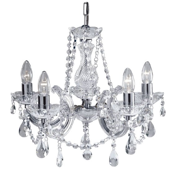 The spectacular, glittering Marie Therese 5 light chandelier with a polished chrome finish has an aristocratic style, perfect for adding a theatrical touch to any large room. A traditional design with a modern twist, this ceiling light is luxuriously adorned with crystal drops, barley twist arms and glass trimmings that adds a glamorous focal point to any interior. Key Features Class (1, 2 or 3):- 1 (Earthed) Lampholder:- E14 Lamp Type:- Led – Candle Lamp Type:- 2 Wattage:- 10 Operating Voltage:- 230V 50hz Lamp Included:- No Shade Shade Type:- Glass/crystal Shade Finish:- Clear Shade Size:- H: 30(mm) W: 100(mm) Dimensions Total Height:- 315(mm) Total Height with Chain:- 910(mm) Width/Diameter:- 480(mm)