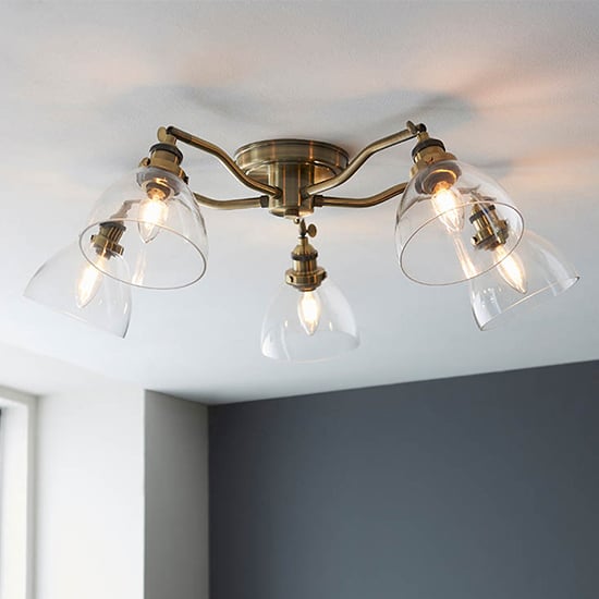Monza 5 Lights Semi-Flush Ceiling Light In Antique Brass, An authentic ‘resto’ style industrial 5 light semi flush, finished in antique brass plating with authentic knurled lamp holder details and clear glass shades. Pair with filament LED lamps for that perfect industrial style. The perfect addition for today’s stylish homes to create that on trend bar, bistro look. Other Family items available. FEATURES : Monza 5 Lights Semi-Flush Ceiling Light In Antique Brass 5 x 7W LED E14 (bulb not included) Antique brass finished metalwork with knurled details Clear glass shades Adjustable heads Ideal for low ceilings Dimmable Twin with E14 LED filament lamp for that unique ‘on trend’ look Available at an affordable price Images shown are for illustration purpose only DIMENSIONS : Projection : 190mm to 210mm Diameter: 650mm to 840mm