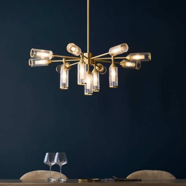 Pillar 13 Light Ceiling Pendant Light In Satin Brass With Clear Ribbed And Frosted Glass This 13 light ceiling pendant features a contemporary design of sculptural tubes and straight lines, each piece of ribbed and frosted glass is capped with satin brass metalwork for a superb addition to modern interiors. FEATURES: * Ceiling pedant light * Satin brass finish * Ribbed clear glass shades * Frosted glass inner shade * Takes 13 lamps * Dimmable with suitable lamp / dimmer switch * Adjustable height SIZE: * Height: 47.5 – 109 cm * Diameter: 89.3 cm BULB: * Requires 13 x G9 LED lamps – NOT INCLUDED