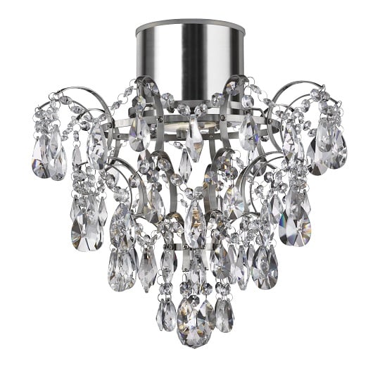 This IP44 chrome semi-flush with clear crystal droplets looks stunning on any bathroom ceiling. The luxurious fitting is fully splashproof and features a downlighter surrounded by decadent crystal trimming and balls. And the elegant mirrored ceiling plate completes the look of this bathroom chandelier. The fitting is also IP44 rated and fully splashproof making it suitable for any bathroom. KEY FEATURES : Class (1, 2 or 3) : 1 (Earthed) Lampholder : GU10 Lamp Type : GU10 LED-IP44 Wattage : 1 X 4w Operating Voltage : 230V 50Hz Lamp Included : Yes Lumens : 300 Colour Temperature : 3000K Weight : 2. 45 Kg SHADE : Shade Type : K5 Glass Drops Shade Finish : Clear DIMENSIONS : Total Height : 380mm Total Height with Chain : 0mm Width/Diameter : 360mm